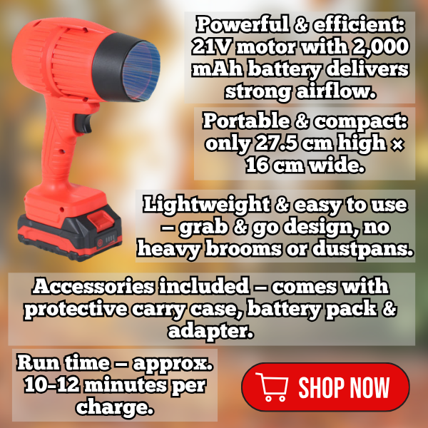 The Mini Handheld Blower is a compact, battery-powered blower designed for quick clean-ups around the home and garden — perfect for clearing leaves, dust, and debris without heavy tools or cords.