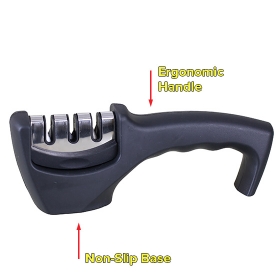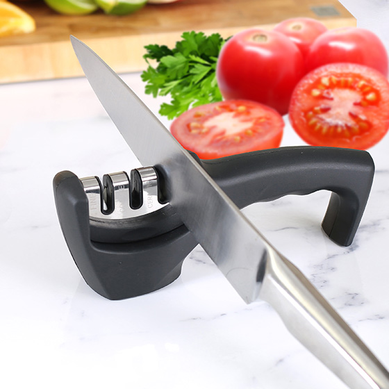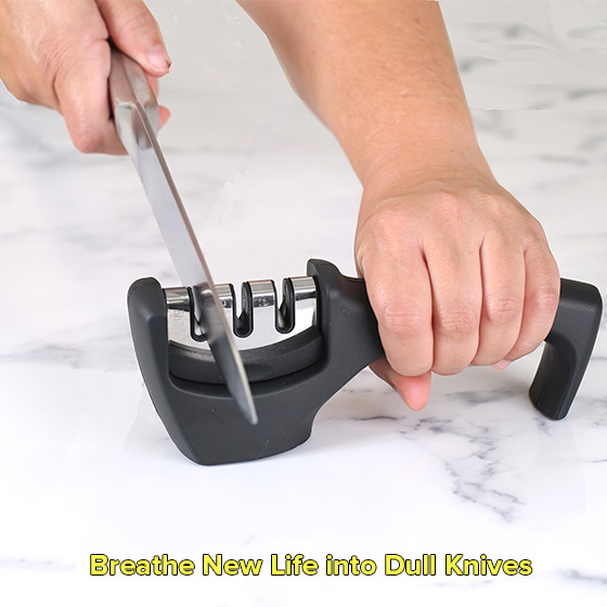 Breathe new life into dull blades with our 3 Stage Knife Sharpener. A sharp knife is much safer in the kitchen than a blunt one, and this sharpener allows you to quickly and easily sharpen almost any knife (not suited for serrated blades or scissors).