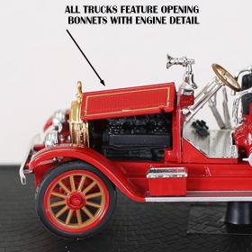 Travel back in time with these lavish classic fire trucks from the roaring 20’s & 40’s. All are 1:50 scale diecast model replicas sitting on a display plaque, all feature hoods that open with detailed interior, exterior and engine compartments and measure approx. 17L x 7H cm.