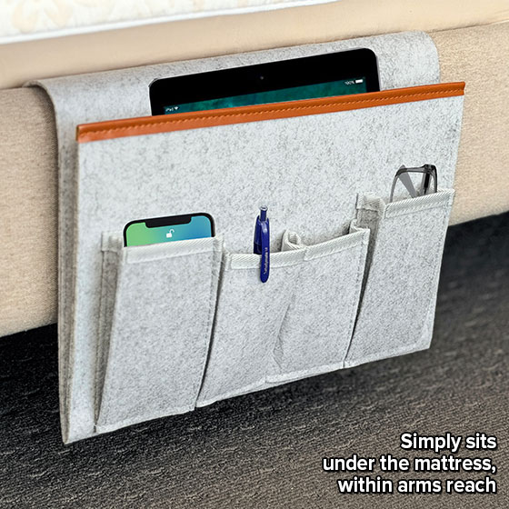 Keep everything you need within easy reach with this felt bedside caddy. Designed to slip under your mattress for a secure hold, it hangs neatly at the bedside with plenty of storage.