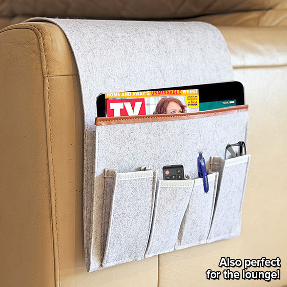 One large pocket holds books, magazines or an iPad, while four smaller pockets organise phones, remotes and other essentials.