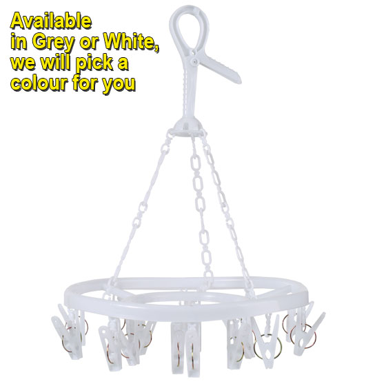 Measures 38cm (incl chain and hook x 27cm dia. Hook rotates 360°. Available in Grey or White, we will pick a colour for you).