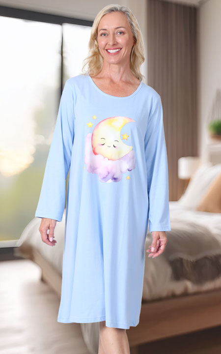 Long sleeve comfortable nightshirt with round neckline and whimsical print. Comfortable cotton knit is perfect for long nights. Machine wash. Approx lengths S–5X; 109-114cm (43”-45”).