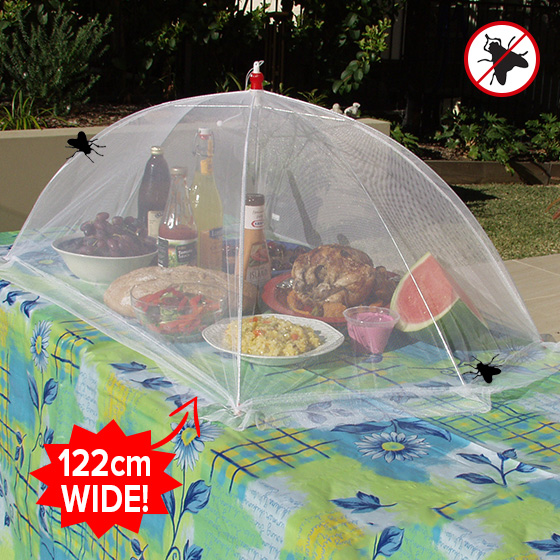Giant Food Umbrella covers your entire table keeping your whole outdoor spread bug free. Roomy enough for large salad bowls, tall jugs, trays, platters and all the condiments. Now you can bug proof your Christmas gatherings, barbeques, alfresco dining, and camping adventures with one simple cover. Pops open for use, folds for storage.