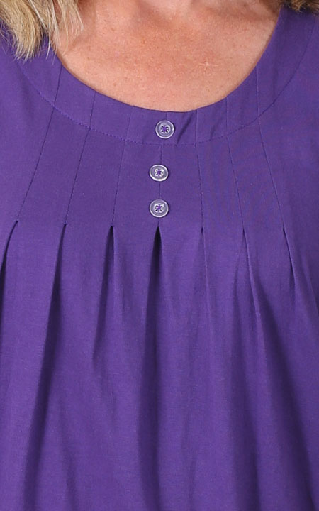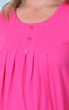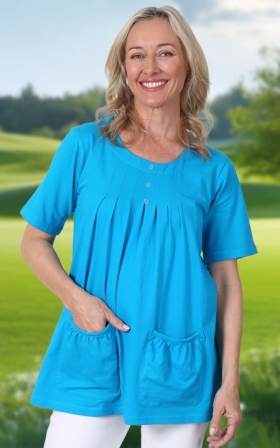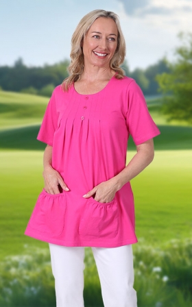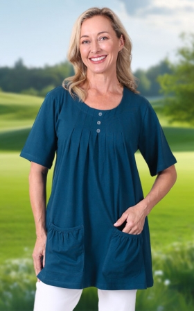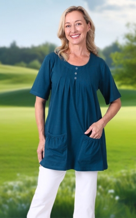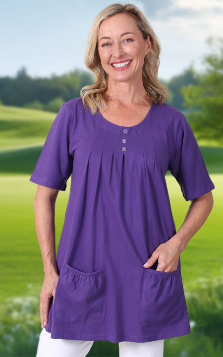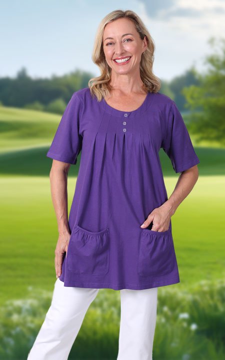 Casual knit tunic with button accents, pleating and patch pockets. Cotton/spandex knit. Machine wash & dry. Approx length 79cm (31”).