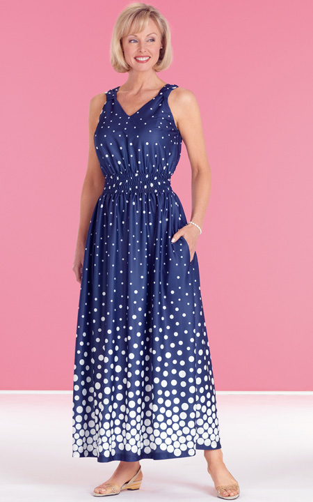 Full-length dress with a flattering stretch smocked waist creates a pretty silhouette and perfect fit. Side seam pockets. Easy-care polyester knit. Machine wash & dry.