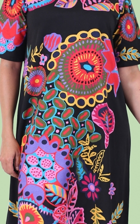 Stunning bold print will escort you cheerfully through the summer season. Vibrant floral print on solid black knit fabric, short sleeves, round neck and a-line hem.