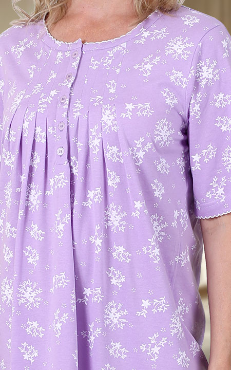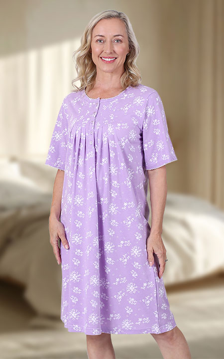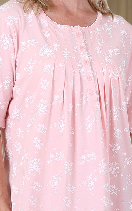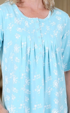 Perfect for summer nights, our cotton rich knit nightgown with partial button, pleated front is a must have. Also features delicate lace trim on sleeves and neckline and a floral print. Approx lengths S – 5X 104cm – 109cm (41” – 43”). Machine wash.