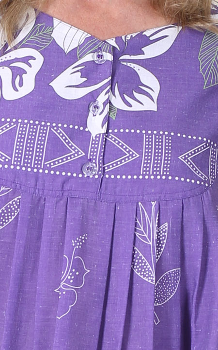 Breezy floral patio dress with button-front placket, pleating and side seam pockets. Woven cotton/polyester. Machine wash.