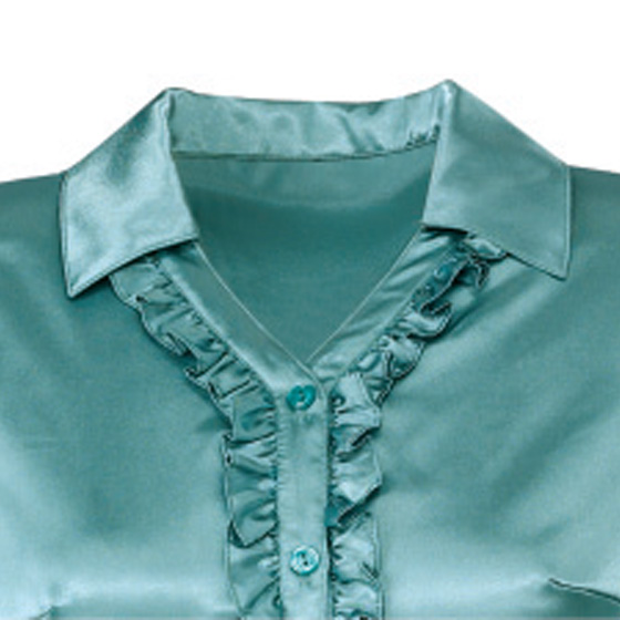 Pretty V-neck, button-front satin blouse with 3/4 sleeves and ruffle trim on placket and cuff. Wovenpolyester/spandex. Machine wash & dry.