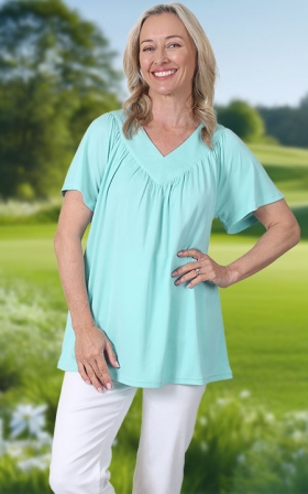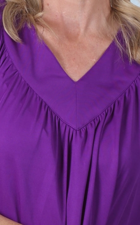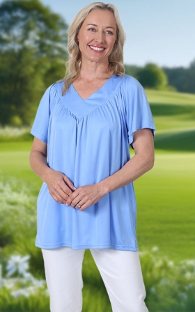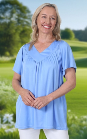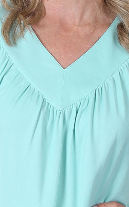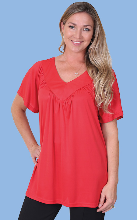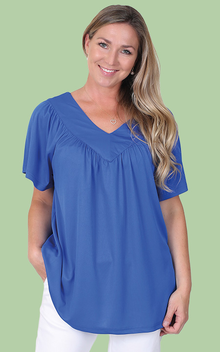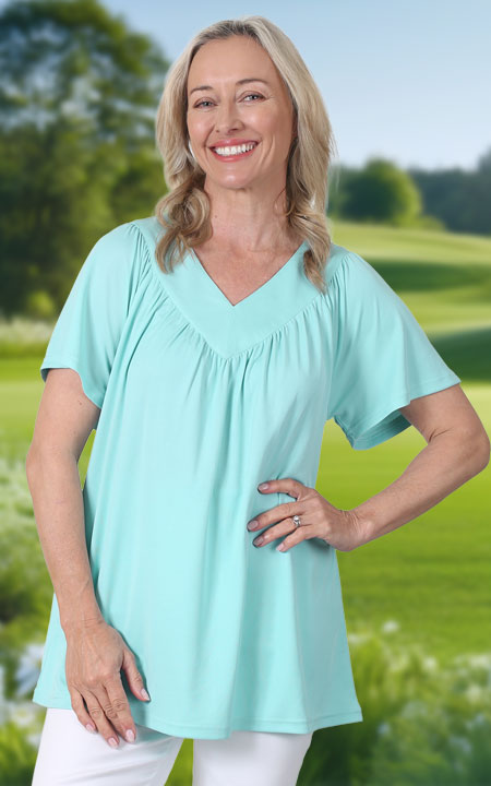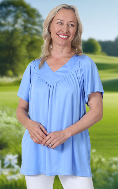 Gentle shirring along the v-neckline flatters every figure. Short sleeves. Polyester/spandex. Machine wash and dry.