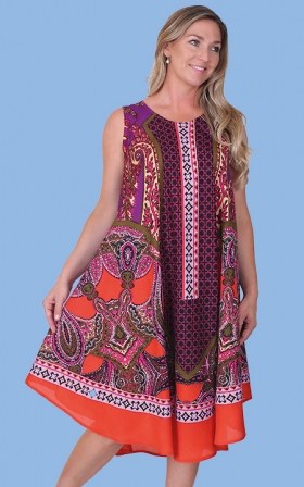 Embrace summer in this cool, flowing, umbrella style sleeveless dress. Round neckline and curved hemline to create an umbrella effect in the dress. Woven Viscose. Hand wash.