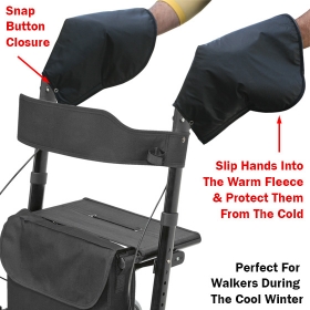 These Versatile Hand Warmers will keep hands and fingers toasty warm! Ideal for anyone using a walking frame, bicycle, cane, or pushing a pram, they are the ideal companion in cooler weather. Their nifty design allows them to fit over most handles and attach using sturdy Velcro and press-studs. Made from heavy-duty, waterproof nylon outer with a warm super soft fleecy inner, they make vital daily exercise a pleasure!